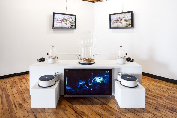 Kuai Shen's installation at InterAccess is biomimetic environment based on a 'do-it-yourself' approach to bioacoustics, measuring the vibratory sounds and mapping the activity of an ant colony and their relation to the artificial ecosystem where they live.