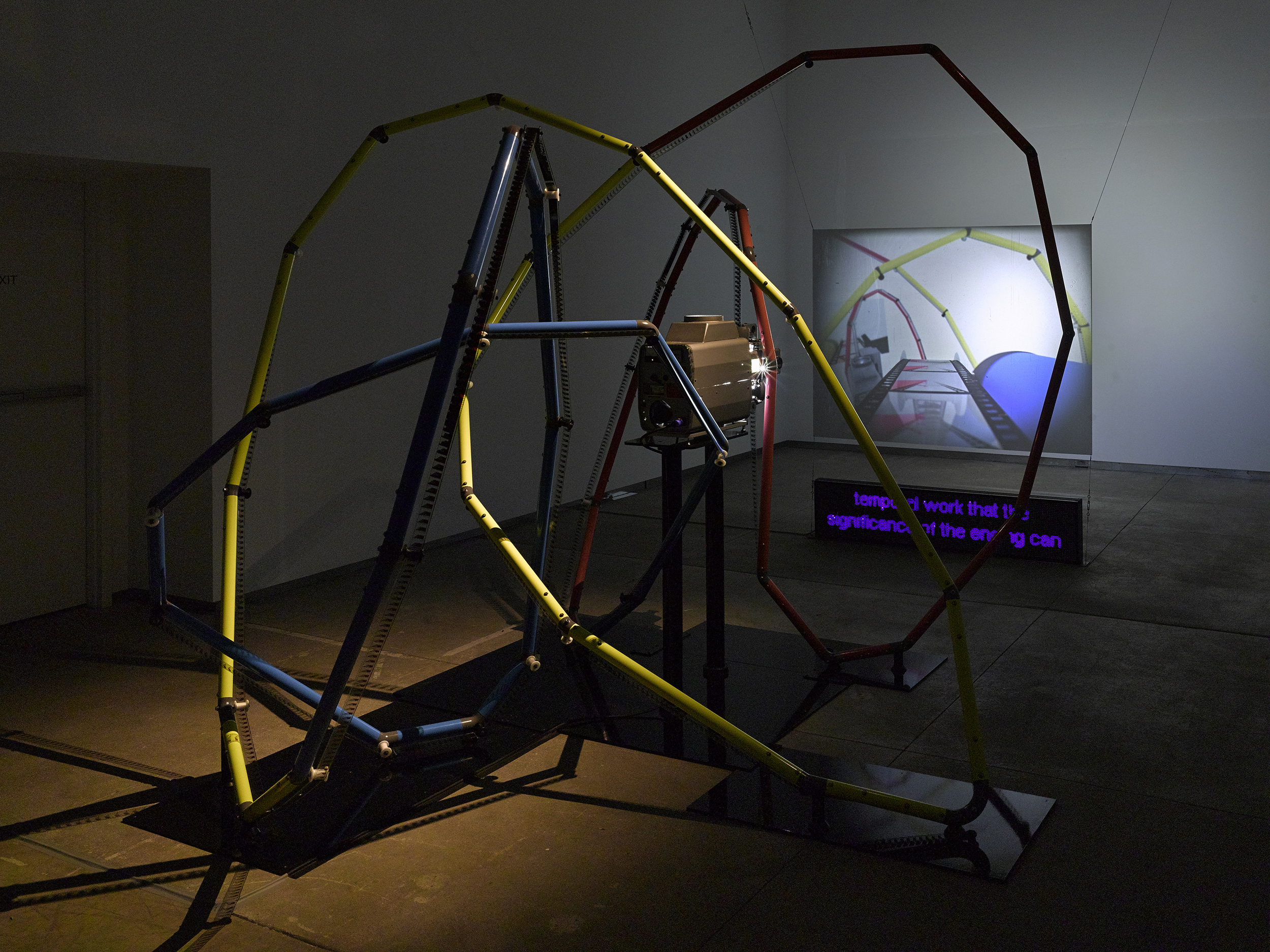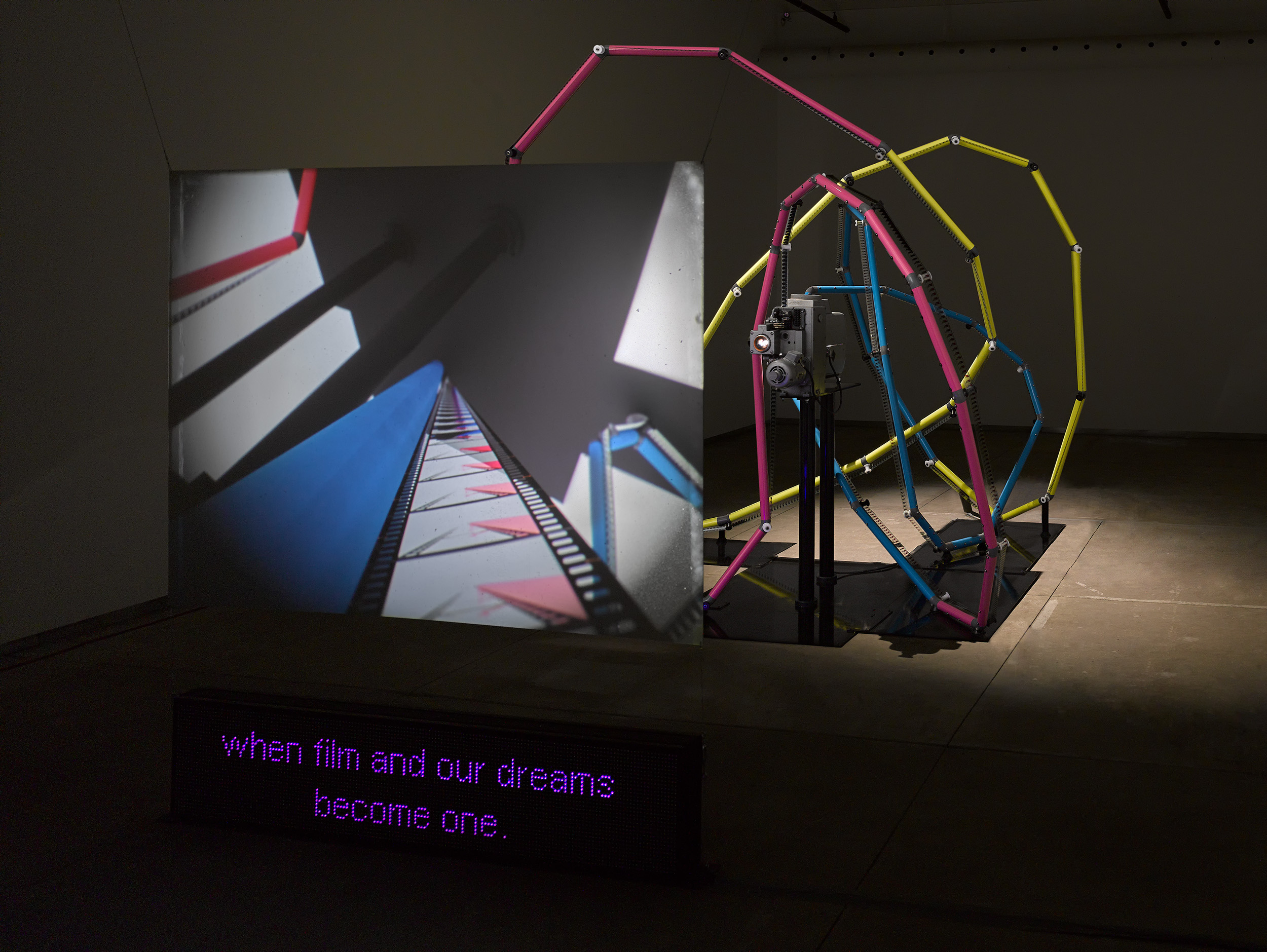 Film Path / Camera Path with under-titles collides the projected image with the apparatus of its presentation and the moving image with sculpture. The project started with the concept of a motion picture projection where the path of the film is the same as the camera path and is composed into a knot. A sculptural materialization of the film loop is made possible by complex multi-planer geometric modeling, parametric design, and additive manufacturing. The 35mm projector presents a one-minute long loop of a camera’s travel along the film path. Accompanying the projection is an LED text screen that displays under-titles prepared for the artwork by poets, theorists, and artists including: John Barlow, Ina Blom, Eric Cazdyn, Geoffrey Farmer, Agnieszka Gratza, Daniel Hambleton, Erín Moure, Bridget Moser, Judy Radul, Patricia Reed, Reza Negarestani, Mohammad Salemy, and Michael Snow.