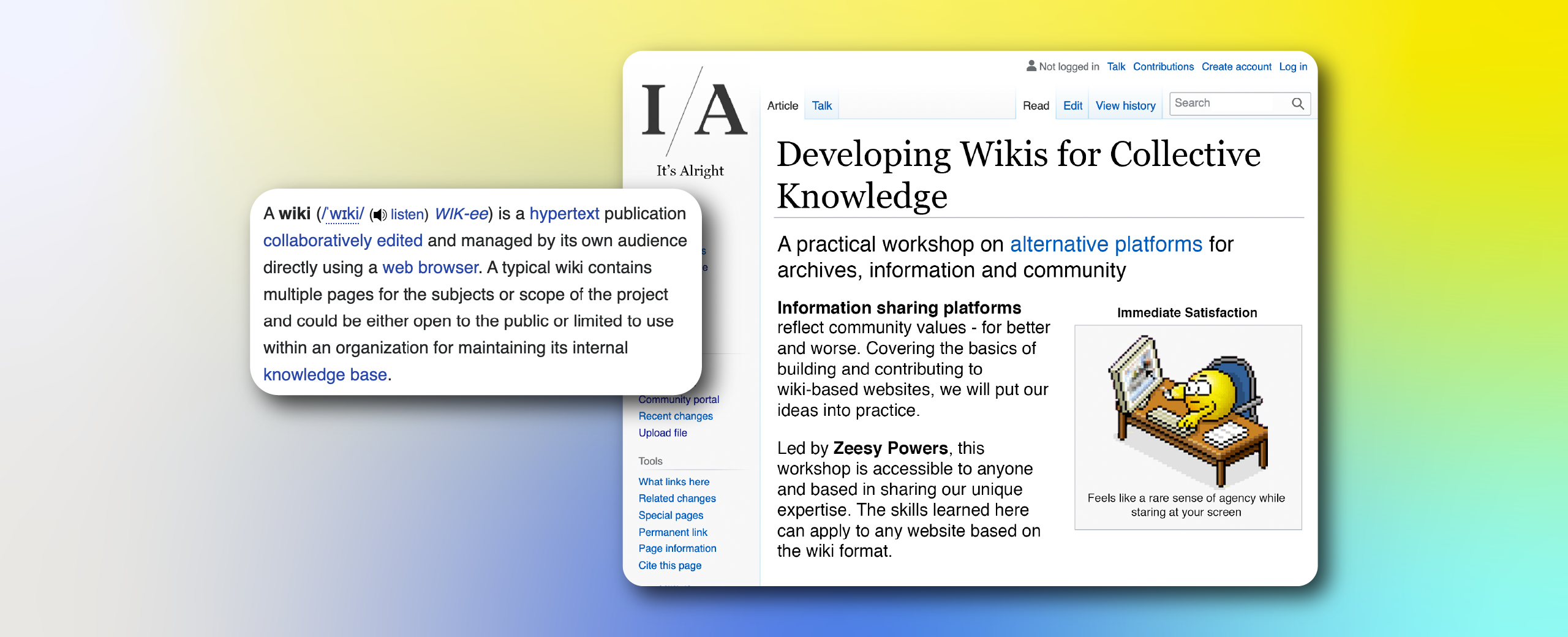 In this workshop, we will discuss how information sharing platforms reflect community values and then put these ideas into practice as we create an experimental wiki website. Covering the basics of building and contributing to wiki-based websites, there is room for more advanced participants to explore the technical aspects of wiki development. While Wikipedia is the most famous wiki, the skills learned here can apply to any website based on the wiki format.