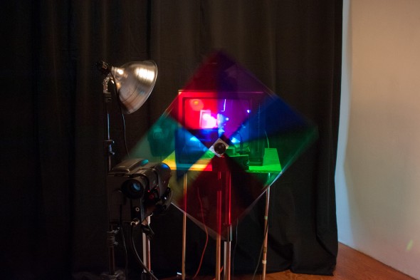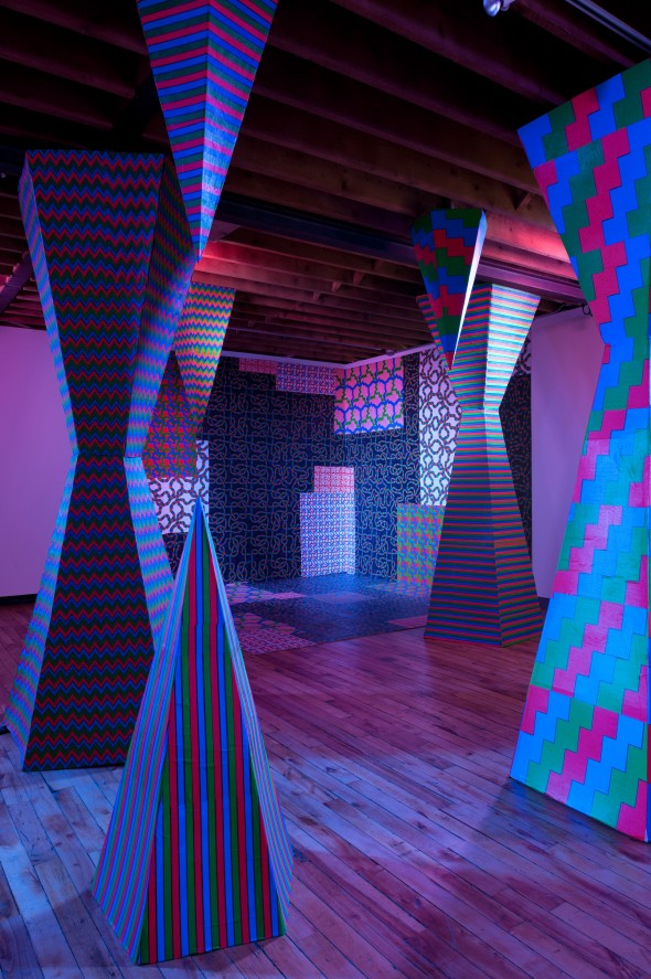 InterAccess is thrilled to present Philippe Blanchard's first solo-exhibition, Time Tunnel, from September 16 to October 15, 2011. Working in 'expanded animation', Blanchard has produced a cardboard and masonite cave plastered with multi-colored (RGB) prints and lighted by customized overhead projectors and L.E.D. strobe lights. As the lights in the gallery change from red to blue to green, the prints take on a crude but mesmerizing motion straddling the line between high and hacky tech.