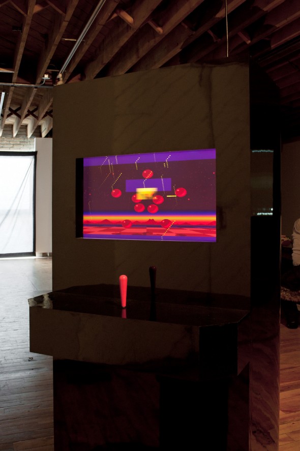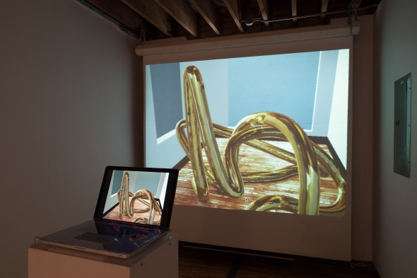 InterAccess is pleased to present Double Back, an exhibition by Toronto-based collaborative duo Jillian Ross and Liam Wylie, from February 17 to March 24, 2012. In Double Back, Ross and Wylie explore the relationship between "the embodied phenomenological experience of travelling through a physical gallery space and the disembodied experience of navigating across one digitally." The exhibition features a number of paintings and sculptures displayed in InterAccess' physical gallery space and recreated in an accompanying virtual gallery space modelled on InterAccess.