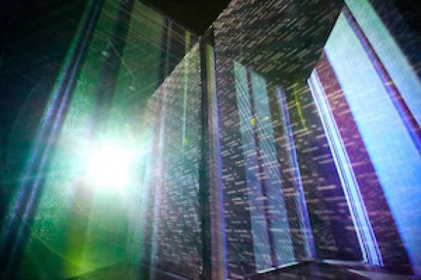 Tasman Richardson's installation work Janus layers Atari 2600 glitch imagery to explore temporal order, failure, and transformation.