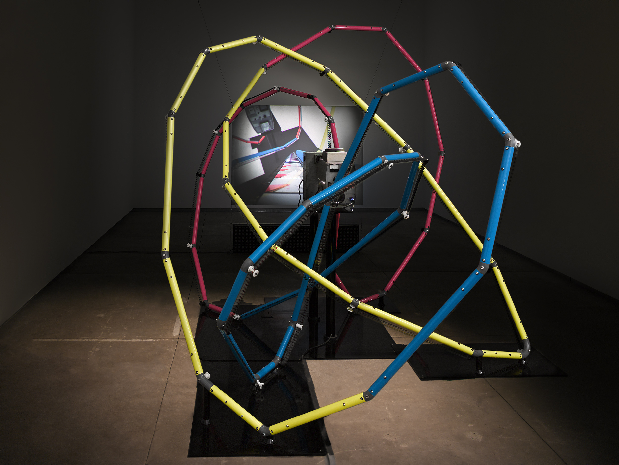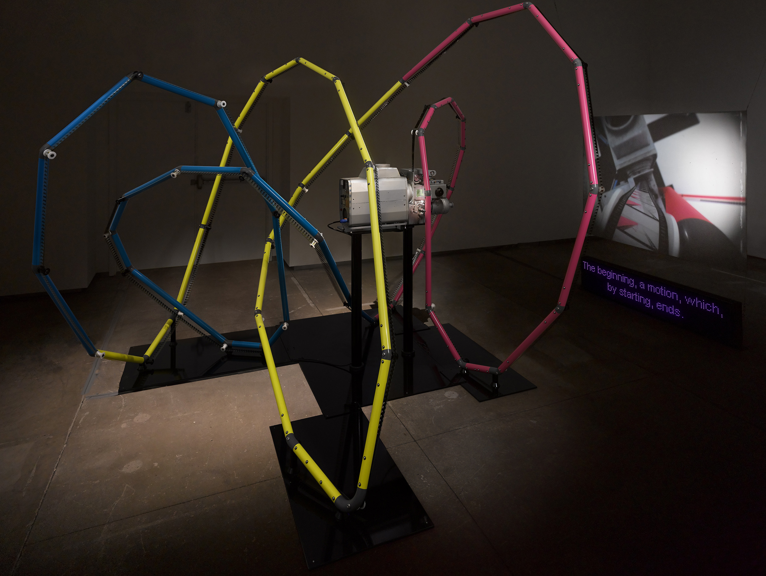 Film Path / Camera Path with under-titles collides the projected image with the apparatus of its presentation and the moving image with sculpture. The project started with the concept of a motion picture projection where the path of the film is the same as the camera path and is composed into a knot. A sculptural materialization of the film loop is made possible by complex multi-planer geometric modeling, parametric design, and additive manufacturing. The 35mm projector presents a one-minute long loop of a camera’s travel along the film path. Accompanying the projection is an LED text screen that displays under-titles prepared for the artwork by poets, theorists, and artists including: John Barlow, Ina Blom, Eric Cazdyn, Geoffrey Farmer, Agnieszka Gratza, Daniel Hambleton, Erín Moure, Bridget Moser, Judy Radul, Patricia Reed, Reza Negarestani, Mohammad Salemy, and Michael Snow.